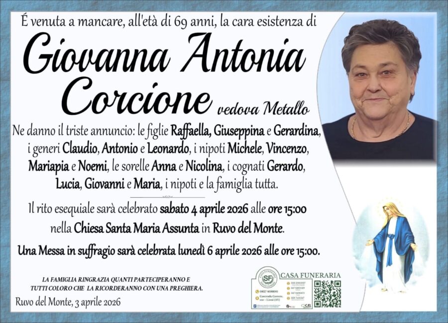 È venuta a mancare, all’età di 69 anni, la cara esistenza di Giovanna Antonia Corcione vedova Metallo. Ne...