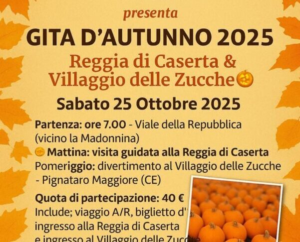 L’Associazione Pro Loco di Ruvo del Monte organizza per sabato 25 ottobre 2025 una splendida Gita d’Autunno all’insegna della cultura, del divertimento e dei colori tipici della stagione. La destinazione? Un doppio appuntamento: la maestosa Reggia di Caserta e il suggestivo Villaggio delle Zucche a Pignataro Maggiore (CE). Programma della giornata Partenza prevista per le...