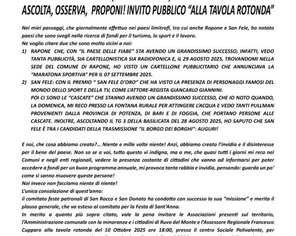 Un grido d’allarme e al tempo stesso una proposta concreta per uscire dall’apatia e rilanciare il territorio: è questo il cuore dell’iniziativa lanciata dall’A.S.D. Rufria 2018 con l’invito pubblico intitolato “Insieme, per il futuro – Ascolta, Osserva, Proponi!”. L’appuntamento è fissato per il 10 ottobre 2025 alle ore 18:00 presso il Centro Sociale Polivalente (o,...