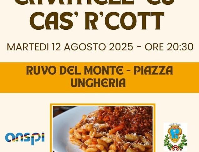 La Pro Loco di Ruvo del Monte, in collaborazione con il Comitato Feste “San Rocco e San Donato”, l’associazione ANSPI e con il patrocinio del Comune, è lieta di invitarvi alla nuova edizione della Sagra dei Cavatelli con Cacio Ricotta, un appuntamento imperdibile che celebra la tradizione culinaria lucana in un clima di festa, condivisione...
