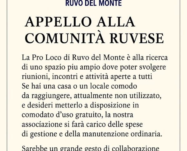 La Pro Loco di Ruvo del Monte ha lanciato un accorato appello alla comunità locale per trovare uno spazio più ampio dove poter svolgere riunioni, incontri e attività aperte a tutti i cittadini. L’associazione, da sempre punto di riferimento per la promozione culturale e turistica del paese, è alla ricerca di una casa o di...