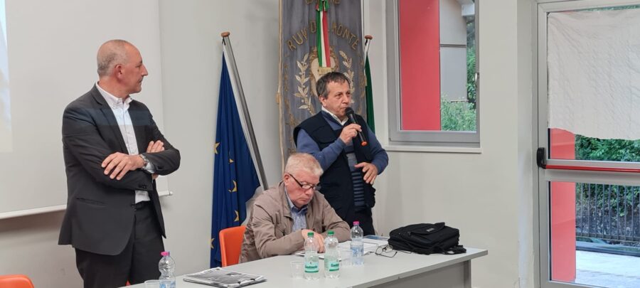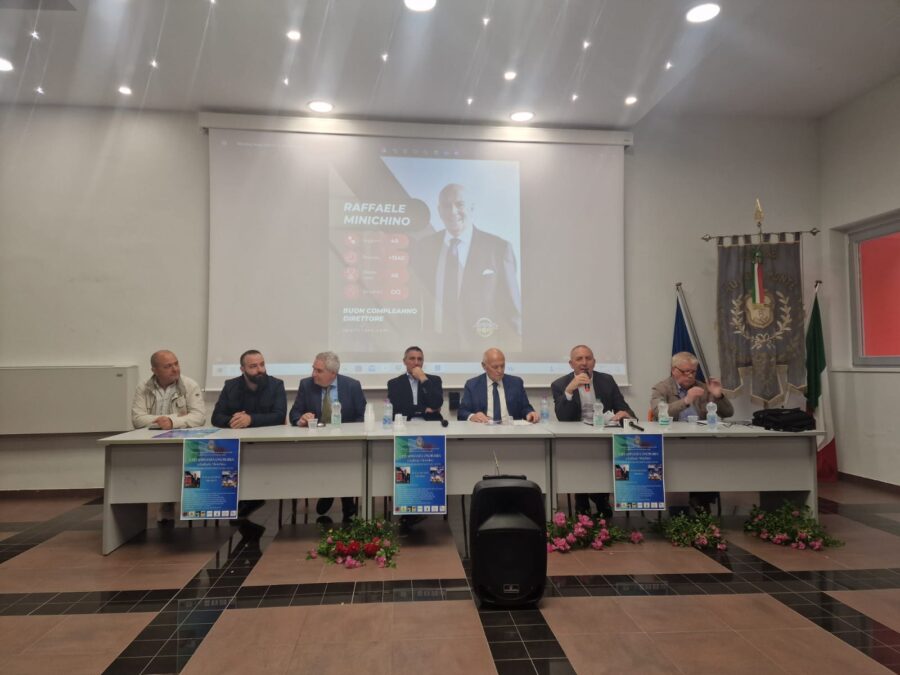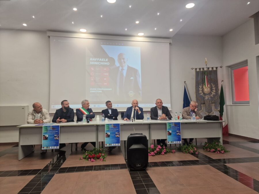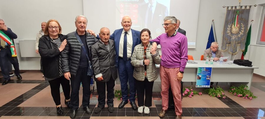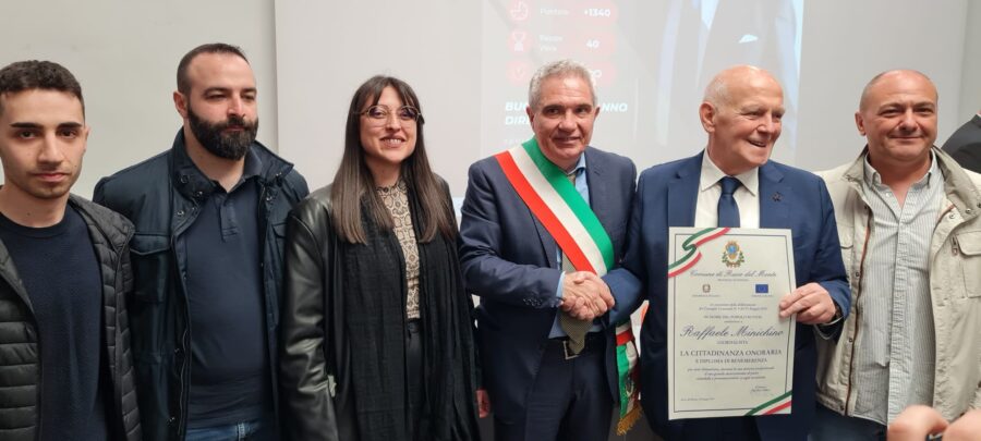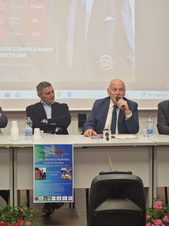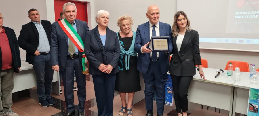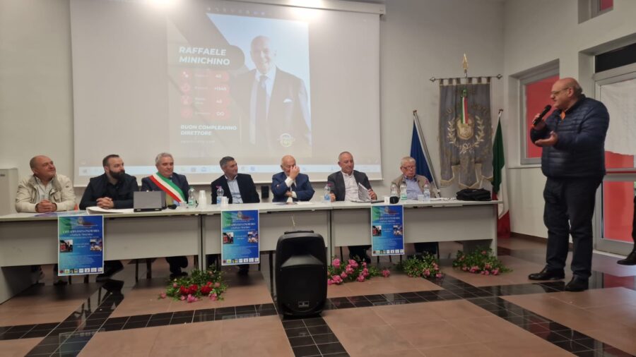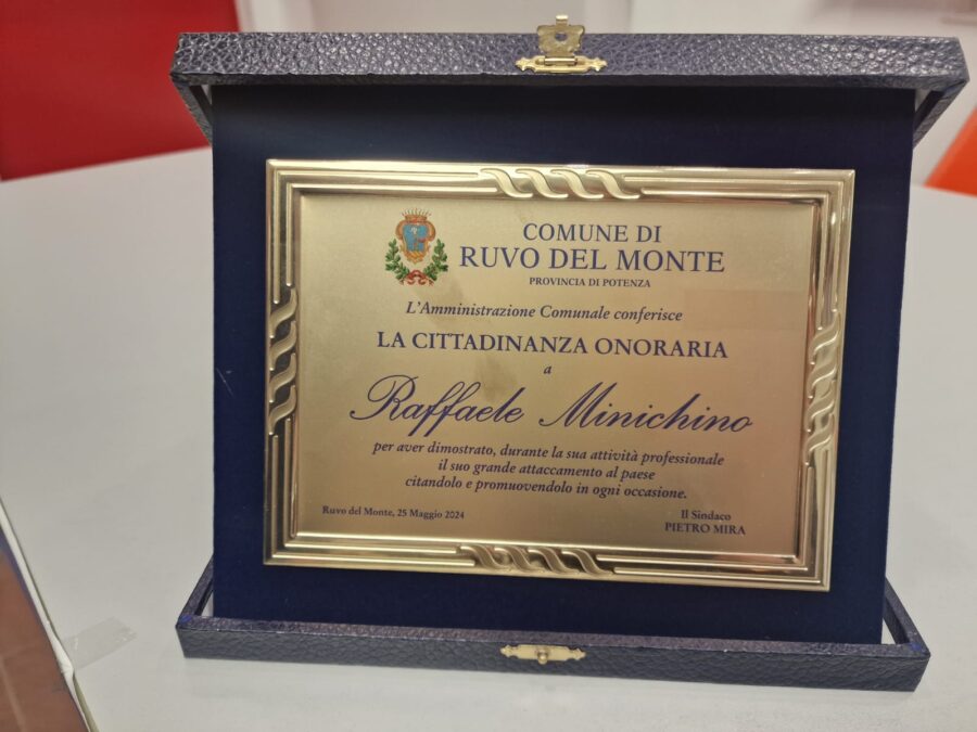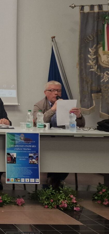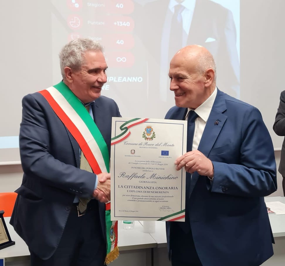 Il 25 maggio 2024 resterà una data memorabile per il piccolo borgo di Ruvo del Monte, luogo di nascita del rag. Raffaele Minichino che, al cospetto di una sala gremita del Centro polivalente, ha festeggiato contemporaneamente il suo 71° compleanno e il conseguimento dell’ambita cittadinanza onoraria. Egli, infatti, all’età di soli 10 anni, dopo essere rimasto orfano di padre si è trasferito a Roma con la famiglia, facendo carriera, fino a diventare direttore sportivo della Tv privata “Rete Oro” (presente in sala per le riprese con la troupe formata da: Marco Fiorilli, Francesco Mancini e Simone Mobrici). Cosicché, grazie alla moderazione di Antonio Petrino di “tg7 Basilicata”, dopo i saluti istituzionali del Sindaco Piero Mira, il reporter, nella doppia veste di addetto alle Pubbliche relazioni dell’ASD Rufria 2018, promotrice dell’evento, ha letto una sintetica scheda biografica di presentazione di Raffaele Minichino e Bruno Giordano ( testimonial della cerimonia), che riportiamo integralmente:
