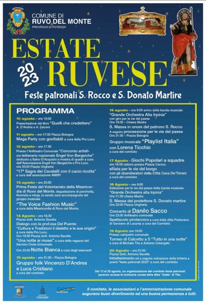 E’ stato presentato il cartellone estivo delle manifestazioni, organizzato dal Comitato Feste “San Rocco e San Donato”, dalle Associazioni ANSPI e PRO LOCO, patrocinate tutte dal Comune di Ruvo del Monte, con tanti eventi, tutti gratuiti che interesseranno l’intero territorio comunale.