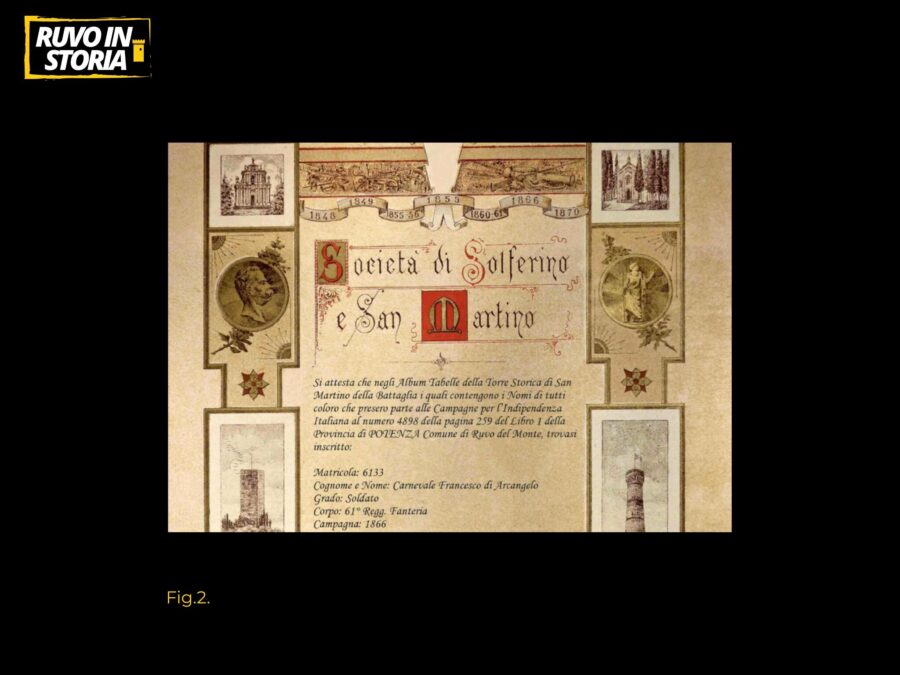 Grazie ai registri manoscritti del fondo Società Solferino e San Martino, conservati presso l’Archivio delle Civiche Raccolte Storiche (Museo del Risorgimento di Milano) e digitalizzati grazie al Progetto Torelli, possiamo integrare la lista con una serie di informazioni rilevanti: il numero di matricola, il nominativo del padre, il grado ricoperto durante il conflitto e l’unità militare di appartenenza. L’elenco che segue non è soltanto una raccolta di nomi ma vuole rappresentare un tassello della storia di Ruvo del Monte e, più in generale, dell’Italia. Non è difficile immaginare che qualcuno, leggendo i nominativi di seguito riportati, possa individuare un proprio ascendente creando, di fatto, un ponte immaginario e diretto tra vicende familiari e storia nazionale. Ricordare questi uomini significa recuperare una parte della nostra “memoria collettiva”. Oltre al valore documentale questa attività di recupero contribuisce a restituire al Risorgimento italiano un posto più definito all’interno della narrazione storica cittadina. In tal modo si colma una lacuna della storiografia locale che, fino ad oggi, aveva in parte oscurato la presenza del ruolo svolto dai ruvesi in questo momento cruciale della storia italiana.