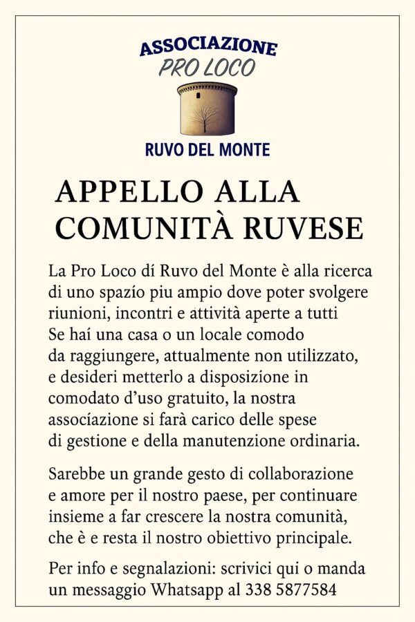 Chiunque sia interessato o disponga di un locale idoneo può contattare l’associazione tramite messaggio WhatsApp al numero 338 5877584 o scrivere direttamente alla Pro Loco per ricevere ulteriori informazioni.