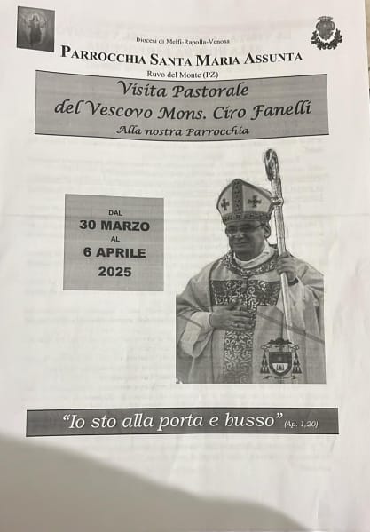 Vi annuncio che il nostro Vescovo,Mons. Ciro Fanelli, con decreto del 7 Dicembre 2022, ha indetto la sua Visita Pastorale in tutte le parrocchie della Diocesi di Melfi-Rapolla-Venosa, nel periodo dal 1 Ottobre 2023 al 5 Ottobre 2025