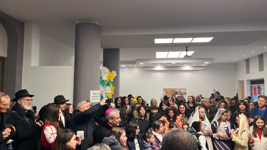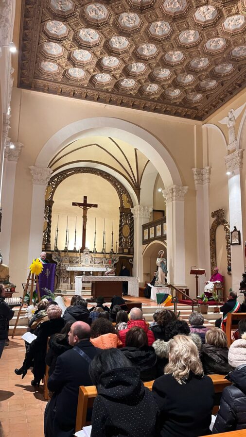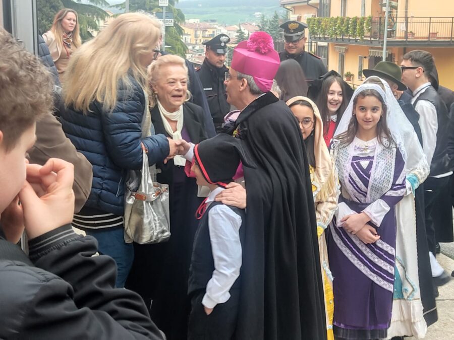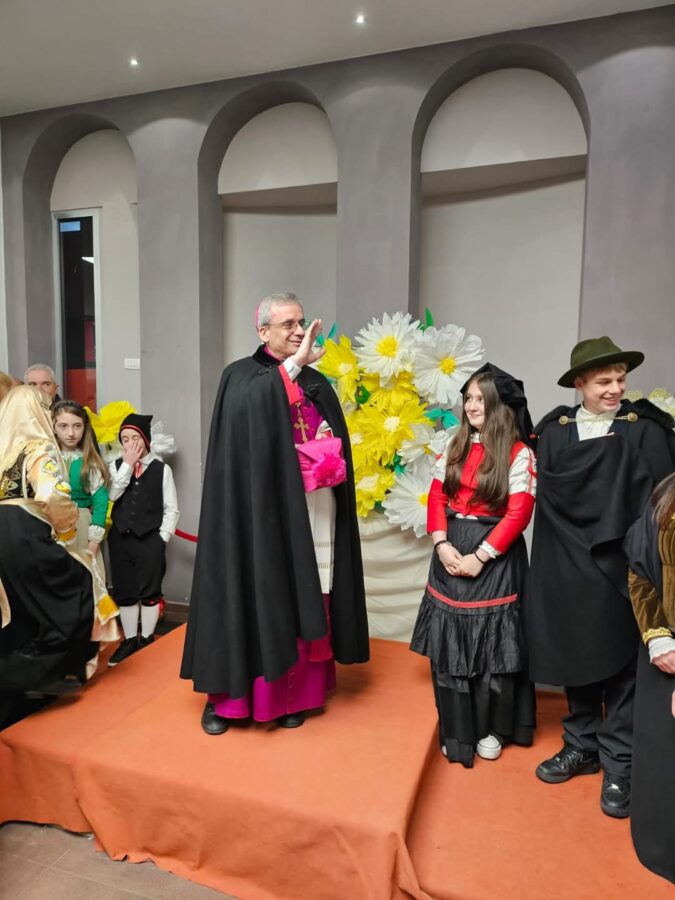 Non sono mancati anche i sorrisi e l’energia dei più piccoli a dare un tocco di allegria e vivacità che con balli tradizionali e coreografie spontanee hanno creato un’atmosfera di festa che ha reso l’accoglienza ancora più calorosa e gioiosa. Ogni nota, ogni passo di danza, ha fatto sì che questo momento fosse non solo un saluto, ma un’espressione di comunità, unita nella fede e nella gioia di accogliere il nostro Vescovo. Successivamente, si è celebrata la solenne Santa Messa nella Chiesa Madre Santa Maria Assunta, il Vescovo ha offerto parole di speranza e di rinnovamento, invitandoci a vivere il cammino di fede con rinnovata fiducia e a rafforzare i legami di comunità. Al termine della Messa, la comunità ha avuto il piacere di proseguire la giornata in un’atmosfera di convivialità. È stato organizzato un buffet presso il Circolo ANSPI, dove i presenti hanno potuto continuare a condividere questo momento speciale con il Vescovo, creando così un’opportunità unica di incontro e di fraternizzazione. Un’occasione perfetta per approfondire i legami tra di noi e con il nostro pastore, in un clima di calore e amicizia.
