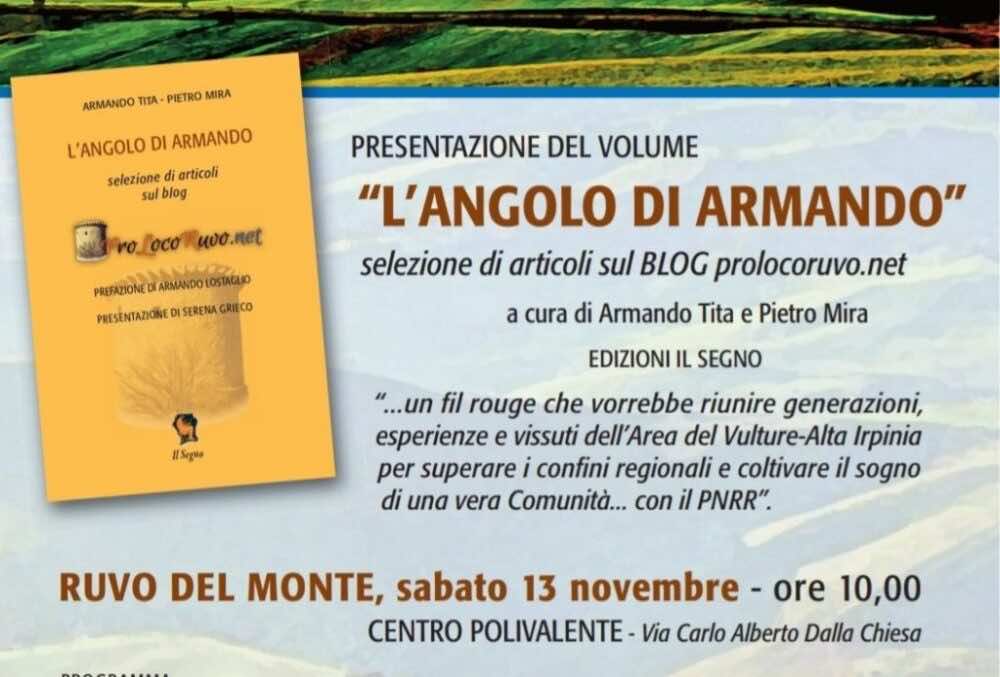 Nella mattinata del 13 Novembre si è svolto, presso il Centro Polivalente, la presentazione del volume “L’angolo di Armando” a cura di Armando Tita e Piero Mira (nell’occasione il presidente Serena Grieco ha conferito ad entrambi la carica di Socio benemerito), in cui è riportata una selezione degli articoli scritti di proprio pugno dal suddetto sociologo sul BLOG/sito della Pro Loco del nostro piccolo paesello. L’incontro, che ha visto una nutrita partecipazione di un pubblico competente e interessato, è stata anche l’occasione per un più ampio e generale punto di vista sui problemi e relative soluzioni da affrontare per i piccoli borghi: infatti, oltre il sindaco Metallo, hanno partecipato alla discussione anche i sindaci limitrofi di San Fele e Rapone che hanno posto l’accento sul futuro, speriamo INSIEME, delle nostre realtà. Sono intervenuti, tra gli altri, l’editore del libro Francesco De Rosa, Armando Lostaglio, grande amico dell’ omonimo fautore dei pezzi giornalistici nonchè giornalista cinematografico e Presidente del Cine Club di Rionero, e persone vicine a chi ha scritto, da quasi 20 anni, di e per Ruvo. Un ringraziamento particolare a chi ha fatto sì che questa giornata abbia avuto così grande seguito, a chi ci ha allietati con interventi specifici su questo e su quel tema e a chi ha partecipato attivamente e non ad una discussione riguardante, alla fine dei conti, non solo il nostro amato borgo ma le specificità dei territori che compongono il nostro unicum lucano.