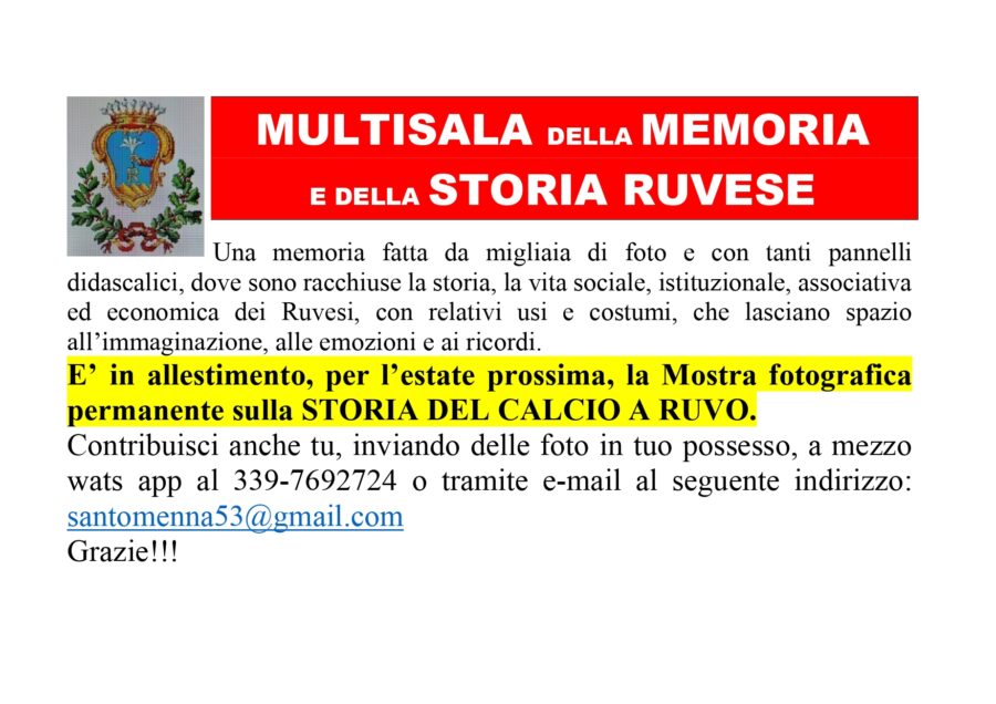 E’ in allestimento, per l’estate prossima,la Mostra fotografica permanente sulla STORIA DEL CALCIO A RUVO.