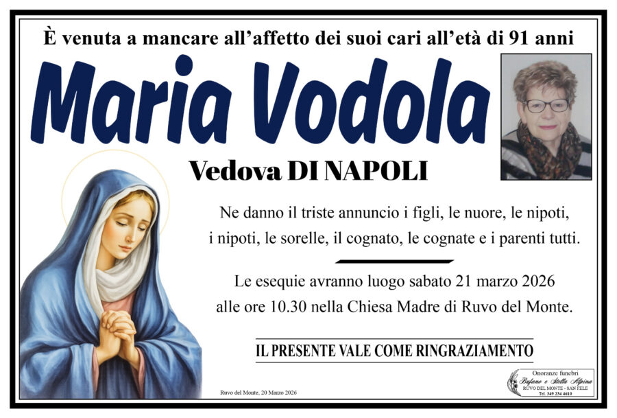 E’ venuta a mancare all’affetto dei suoi cari all’età di 91 anni, la cara esistenza di Maria Vodola....