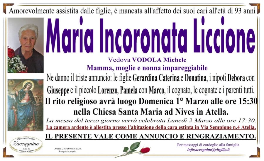 Amorevolmente assistita dalle figlie, è mancata all’affetto dei suoi cari all’età di 93 anni, Maria Incoronata Liccione. Vedova...