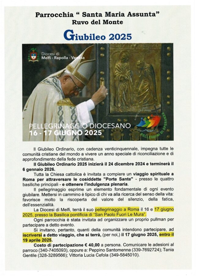 Si invitano, pertanto, quanti della comunità intendono partecipare, ad iscriversi a detto viaggio,che si terra, (per noi,) il 17 Giugno 2025, entro il 19 Aprile 2025.