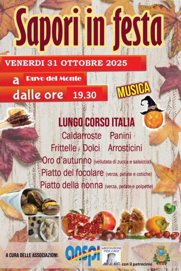 Venerdì 31 ottobre 2025, a partire dalle ore 19:30, le vie di Ruvo del Monte si animeranno con i profumi e i colori dell’autunno per la nuova edizione di “Sapori in Festa”, l’evento gastronomico che celebra le eccellenze culinarie locali e le tradizioni popolari.