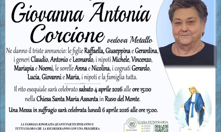I funerali saranno celebrati mercoledi’ 8 aprile alle ore 15:30 nella Chiesa di S.Maria Assunta di Ruvo del Monte, muovendo dall’ospedale San Carlo di Potenza.