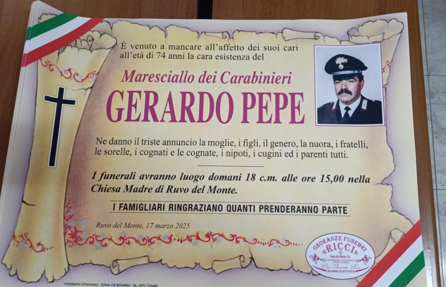 I funerali avranno luogo domani, 18 marzo 2025 alle ore 15.00 nella Chiesa Madre di Ruvo del Monte.