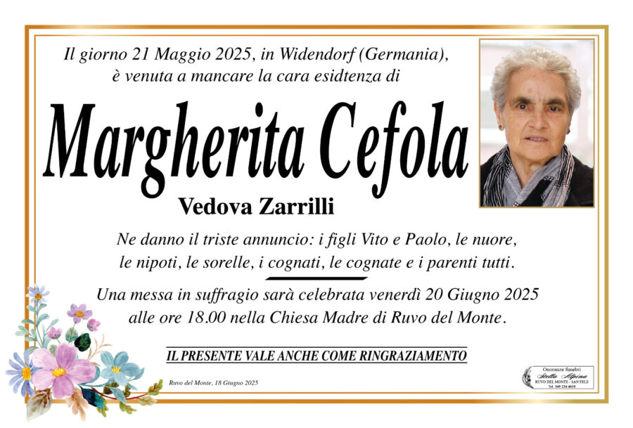 Il giorno 21 Maggio 2025, in Widendorf (Germania) è venuta a mancare all’affetto dei suoi cari la cara esistenza di Margherita Cefola