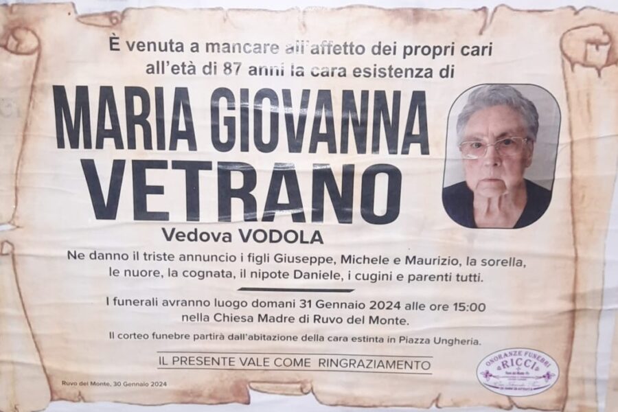 È venuta a mancare all’affetto dei suoi cari all’età di 87 anni la cara esistenza di Maria Giovanna Vetrano.