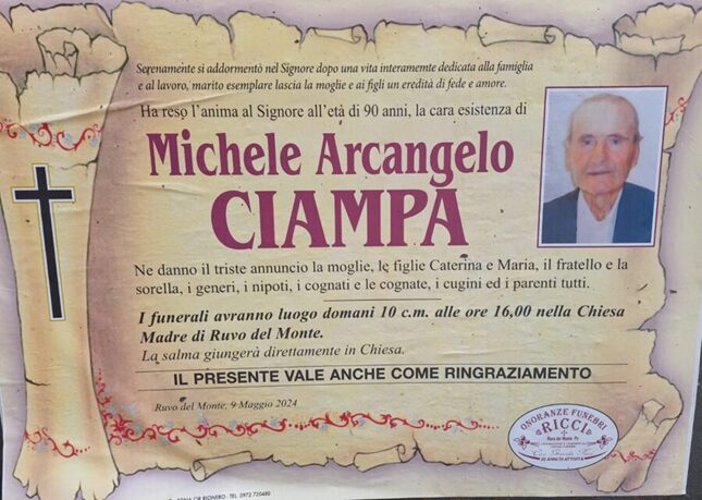 Ha reso L’anima al Signore all’età di 90 anni la cara esistenza di Michele Arcangelo Ciampa.