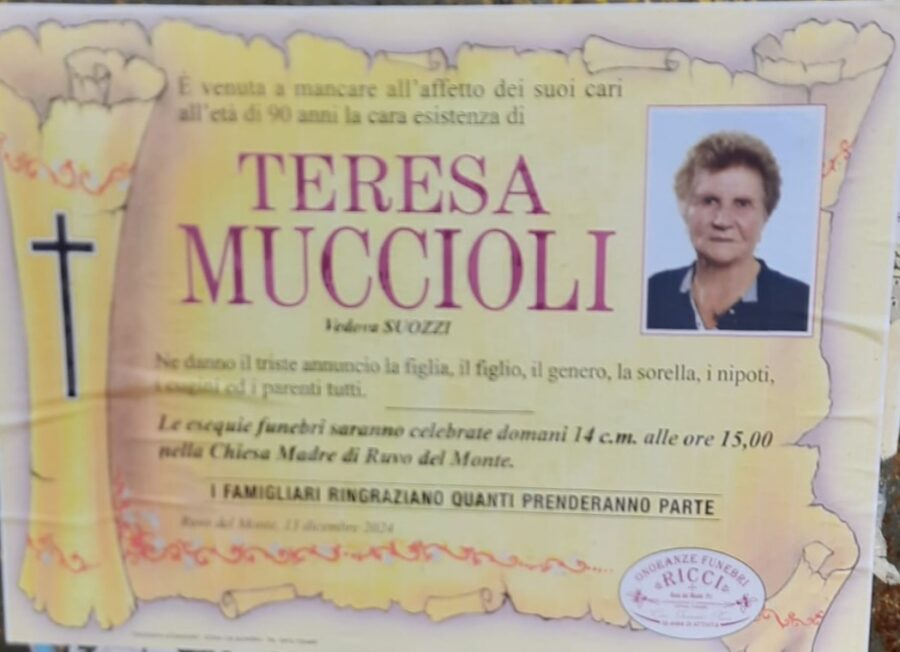 E’ venuta a mancare all’affetto dei suoi cari all’età di 90 anni la cara esistenza di Teresa Muccioli.